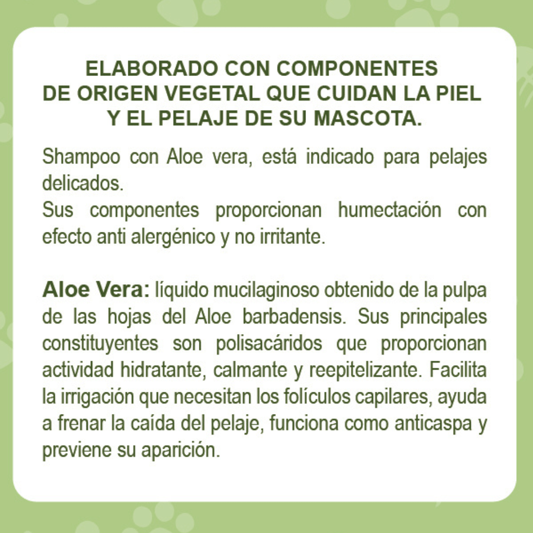 Aloe Vera es un extracto mucilaginoso, de naturaleza orgánica de textura viscosa, que es obtenido del Aloe barbadensis, está constituido por polisacáridos que proporcionan una acción hidratante que calma la piel y que tiene un efecto reepitelizante, es decir, en caso de daño en la piel, ayuda a formar tejido nuevo. Facilita la irrigación que necesitan los folículos capilares, ayudando a detener la caída del pelaje, funciona como anticaspa y lo más importante es que previene su aparición.