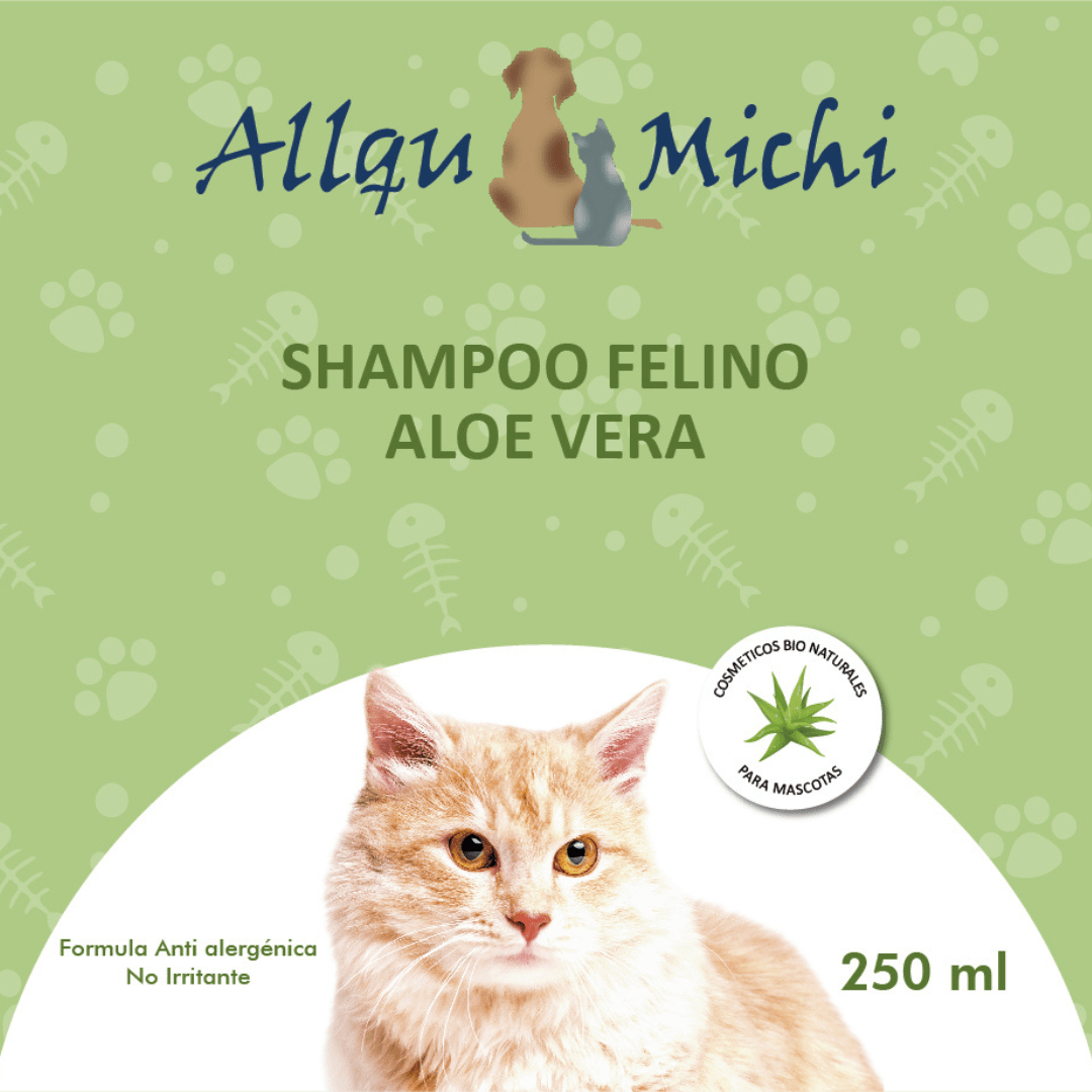 Prepárate para darle a tu mascota el cuidado que merece con el mejor shampoo felino Allqu Michi con Aloe Vera en su envase de 250 ml.!